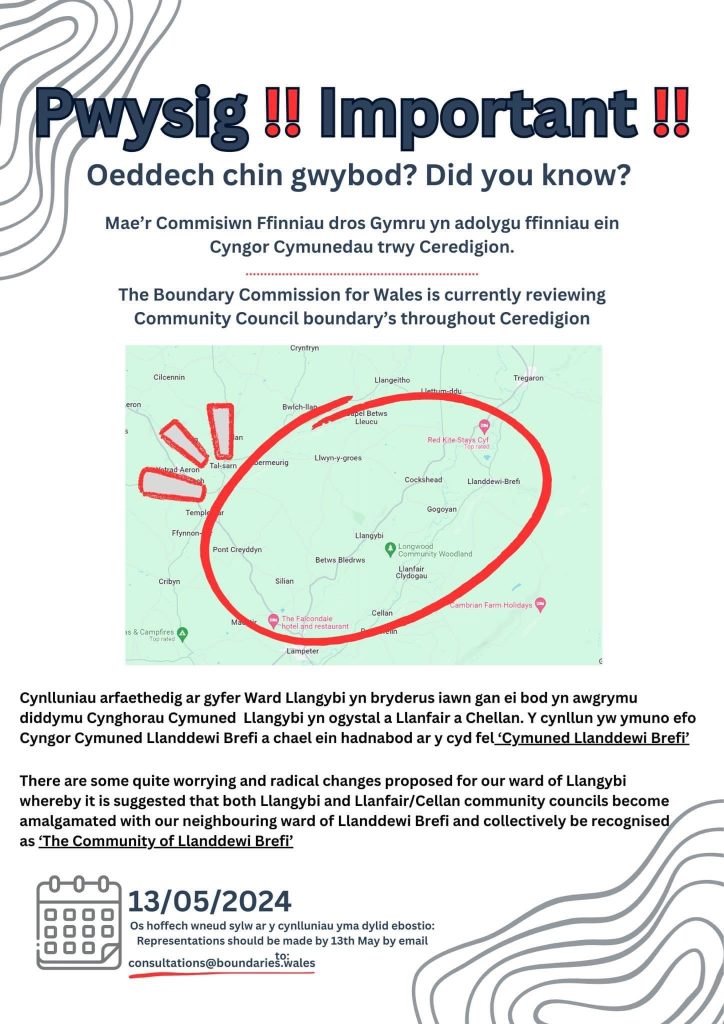 Ysgrifennaf atoch fel Cadeirydd Cyngor Cymuned Llanfair Clydogau a Chellan (CC) yng Ngheredigion, gyda chymeradwyaeth y CC, i wrthwynebu’r newidiadau hyn i’r ffiniau. Yn ein llythyr blaenorol o wrthwynebiad, dywedodd y Clerc fod Cynghorwyr newydd wedi eu hethol a’n bod yn edrych ymlaen at ddatblygu syniadau newydd a gwasanaethu’r gymuned wrth symud ymlaen.