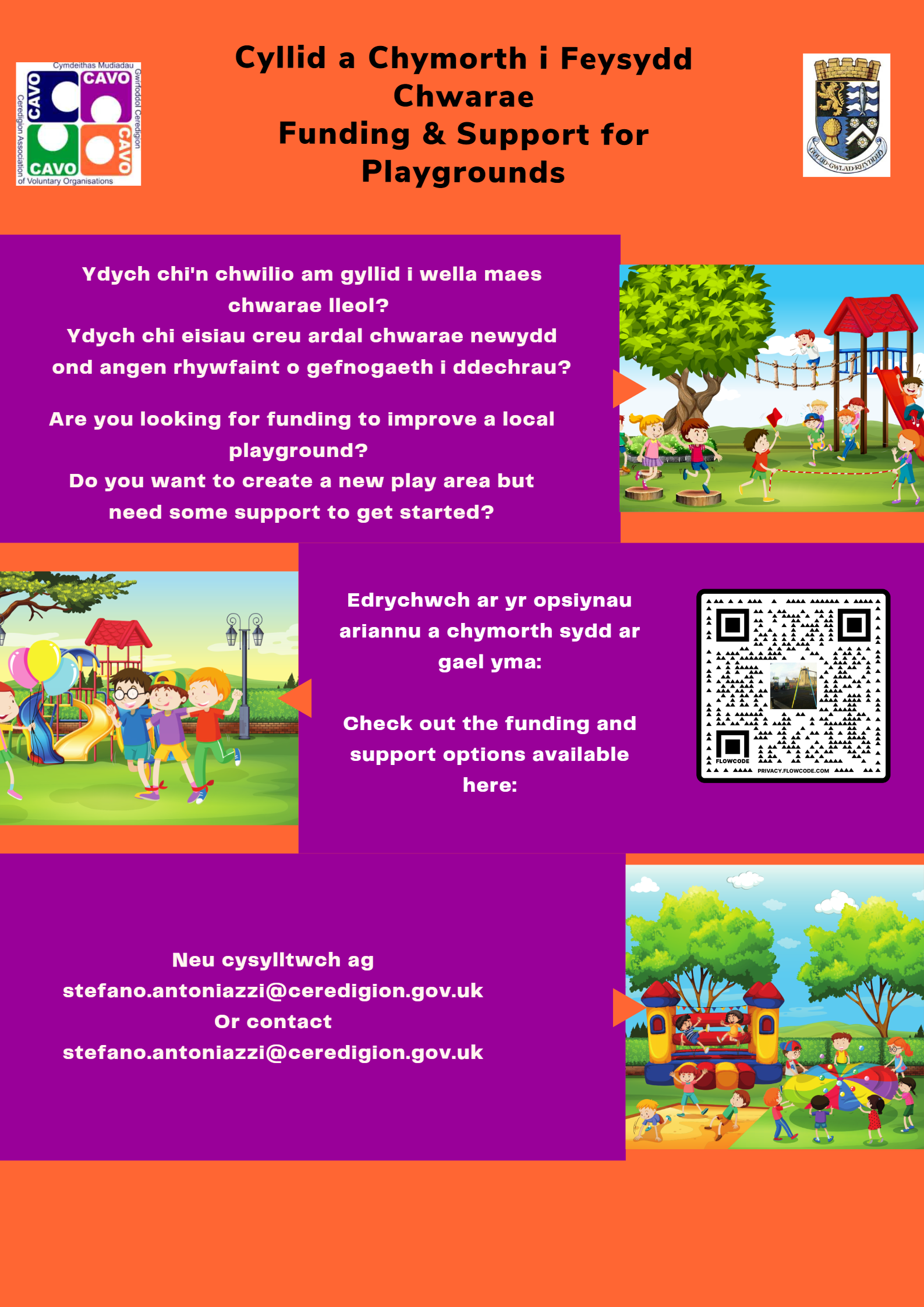 Mae’r llyfryn cyllido ar gael i’w lawrlwytho o blatfform Cyswllt Ceredigion, yn y Tîm Meysydd Chwarae. Mae’r blatfform Cyswllt Ceredigion yn cysylltu sefydliadau ac unigolion ar draws Ceredigion a mae’n rhad ac am ddim i’w ddefnyddio. Mae e’n reolir gan CAVO. Os hoffech ragor o arweiniad ynglŷn â defnyddio’r blatfform Cyswllt , cysylltwch â Rebecca Kirby (rebecca.kirby@cavo.org.uk) neu Chesca Ross (Chesca.ross@cavo.org.uk), neu ffoniwch CAVO ar 01570 423 232.